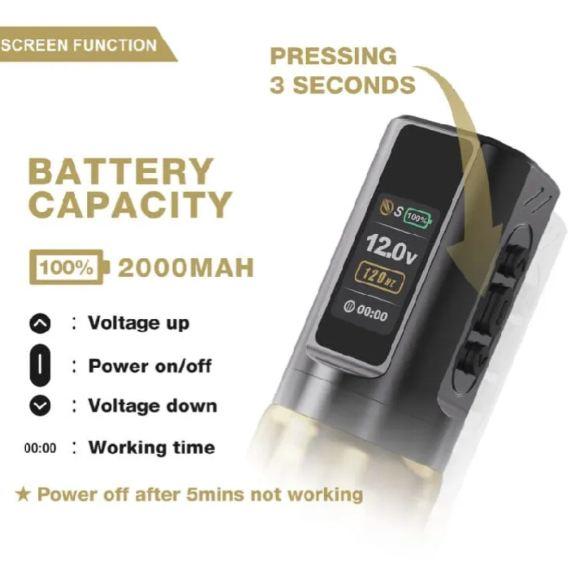 Versatile Features: With its color Smart Display, you can effortlessly monitor voltage, Hertz, battery life, and usage time. Additionally, the wireless tattoo machine features a jump-start function, 360-degree battery positioning, and fixed line and shader mode, making it ideal for artistic creations.